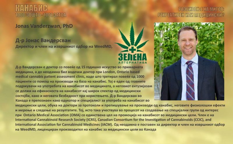 На овие предавачи ќе им се придружи и д-р Јонас Вандерсван, доктор од Канада, кој подолго време препишува канабис и екстракти од канабис за огромен број болести каде што тие имаат примена, и член на повеќе друштва и асоцијации за употребата на канабисот како медицинско средство.