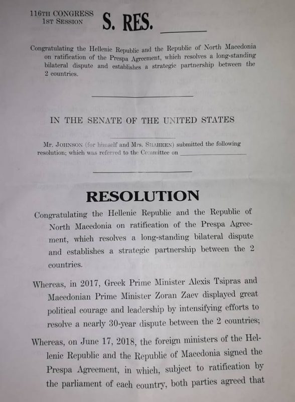 Како што информираат од Кабинетот на Османи, честитајќи на успехот на земјата, сенаторот Џонсон го известил вицепремиерот за неговата иницијатива, заедно со сенаторката Џејн Шахин, до американскиот Сенат, со резолуција која сенатот се очекува да ја усвои на почеток на следната недела, да се поддржат активности на Македонија и Грција во однос на имплементацијата на договорот од Преспа.