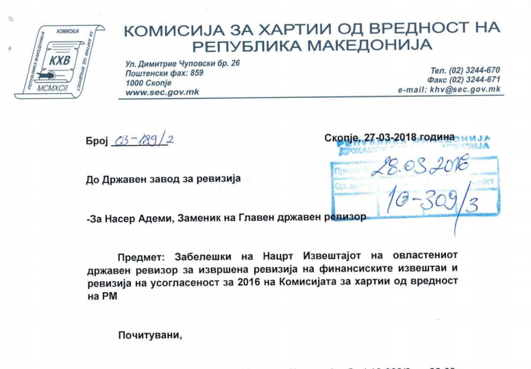Државниот завод за ревизија утврди серија пропусти и неправилности при работата на Државната комисија за хартии од вредност во ревизорскиот извештај. Во извештајот пишува дека претседателката на Комисијата, Елизабета Чингаровска, во 2015 година склучила Колективен договор со синдикална организација со кој на вработените им биле дадени поголеми права од правата утврдени со закон. Ревизорите напишале дека за 2016 година вработените во Комисијата си поделиле повисок износ за регрес за годишен одмор.