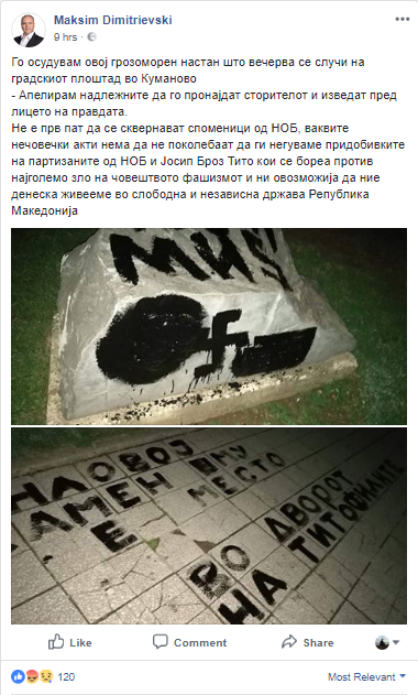 „Не е прв пат да се сквернават споменици од НОБ, ваквите нечовечки акти нема да не поколебаат да ги негуваме придобивките на партизаните од НОБ и Јосип Броз Тито кои се бореа против најголемо зло на човештвото фашизмот и ни овозможија да ние денеска живееме во слободна и независна држава Република Македонија“, додаде градоначалникот.