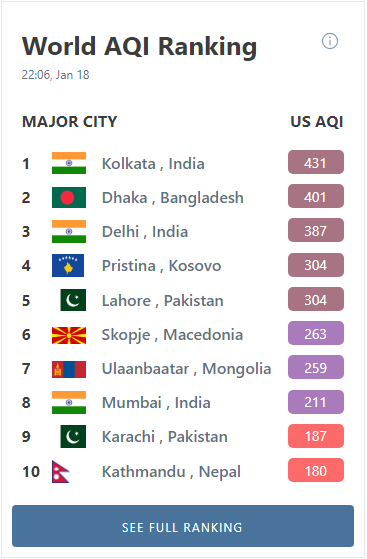 Според „Ер вижуал“, специјализираната интернет-страница за следење на квалитетот на воздухот, Скопје вечерва е на шестото место во светот според загаденоста. На оваа страница рангирањето се врши според збирните податоци од мерните станици поставени во светските градови кои се соочуваат со лош квалитет на воздухот.