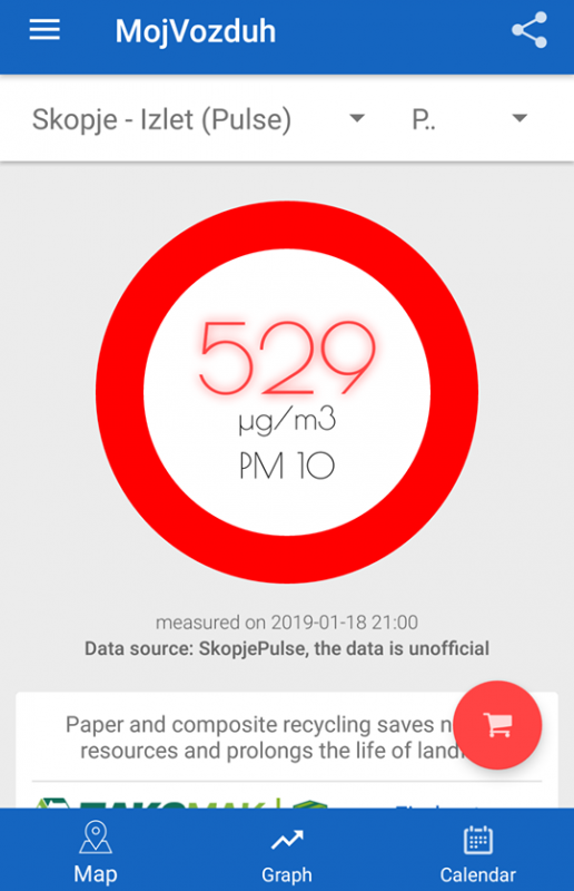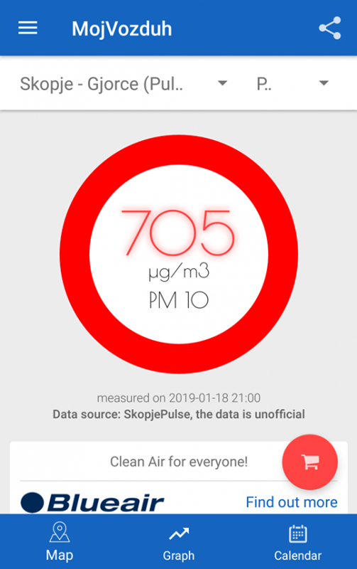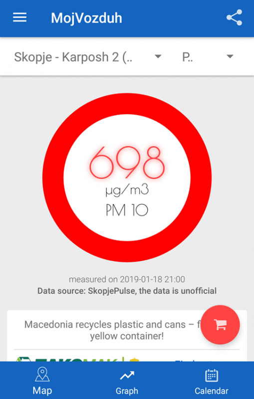 Мерењата презентирани на оваа апликација особено високо ниво на загаденост покажаат во скопската населба Ѓорче Петров каде што околу 21 часот присуството на ПМ10-честички изнесуваше 705 mg/m3.