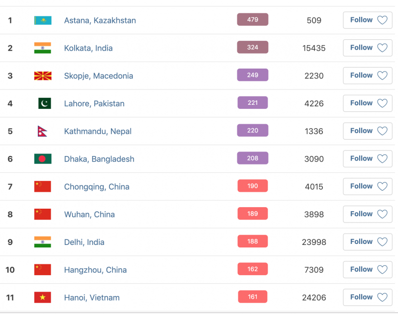 Податоците објавени на страницата „Ер Вижал” покажуваат дека и синоќа и денесја, Скопје се наоѓа високо на листата на најзагадени градови. Изутрината потешко се дише само во Казахстан и Индија. Индексот на загадувањето е 249.