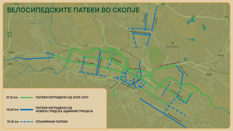 „За жал, до 2017 година беа изградени само 60% од планираната велосипедска мрежа. За една година успеавме да изградиме дополнителни 20% со што се искачивме на 80% од мрежата потребна за поврзување на градот“, нагласи портпаролот и додаде дека за само една година е изградена и реконструирана 4 пати поголема должина на велосипедски патеки од просекот во претходните години.
