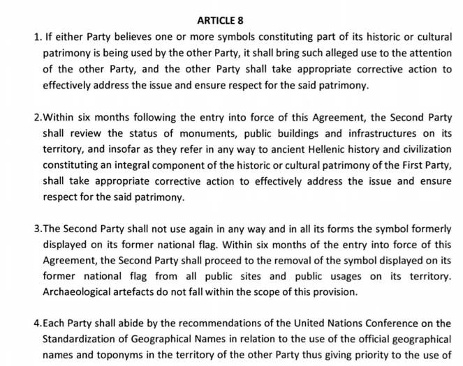 Во рок од шест месеци од стапувањето во сила на договорот со Грција земјата ќе треба да го испита статусот на спомениците, јавните згради и инфраструктури на нашата територија и доколку тие на кој било начин се однесуваат на античката историја на Грција и на цивилизацијата што претставува интегрален дел од историското или културното наследство на Грција, ќе преземе соодветни корективни мерки за да може ефективно да се реши прашањето и да се обезбеди почитување на наследството. Ова е предвидено во договорот што Македонија и Грција се очекува да го потпишат викендов до цел решавање на дводеценискиот спор за името.