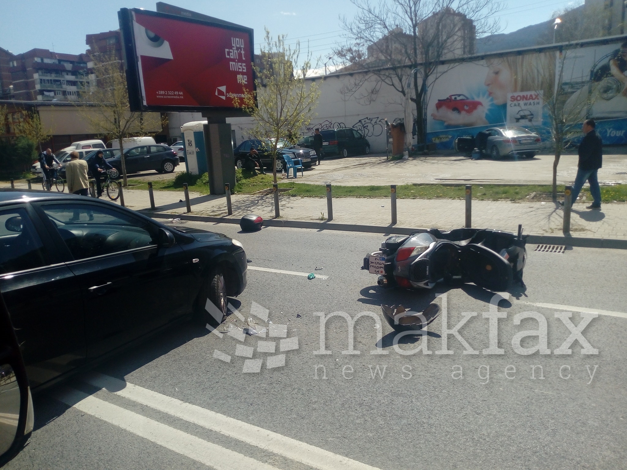 Сообраќајна несреќа меѓу автомобил и мотор се случи на булеварот Метрополот Теодосиј Гологанов. Очевидци велат дека до судирот дошло кога возачот на автомобилот се обидел на полни линии да влезе во спротивната лента и удрил во моторот.
