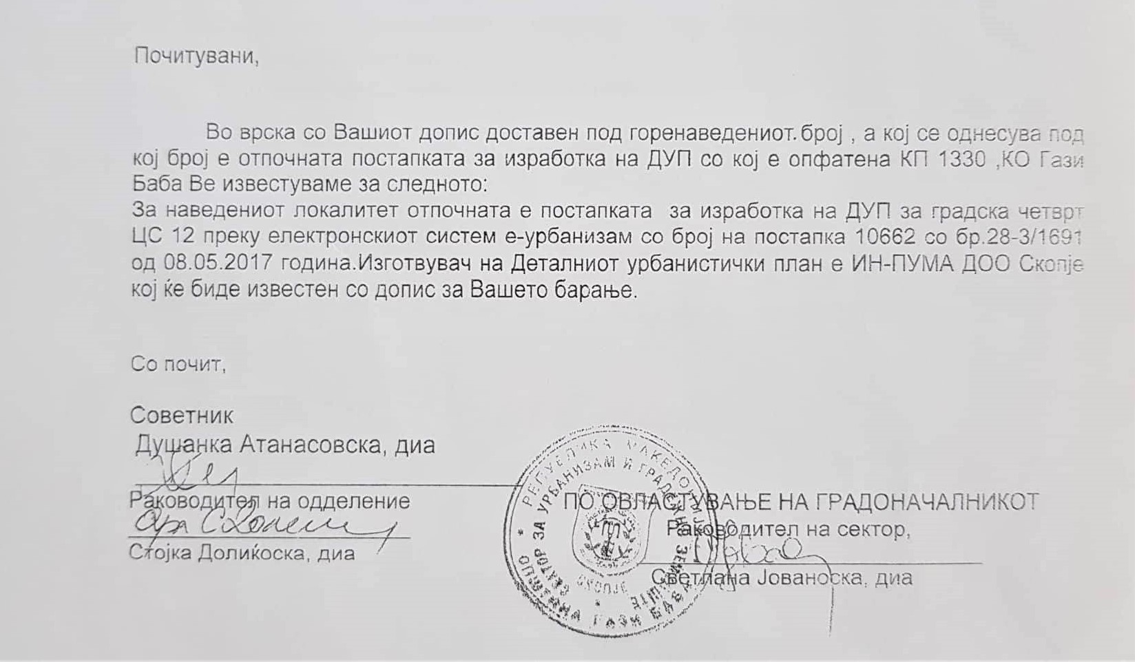Општината добила и писмо од инвеститорот во кое пишува дека „Бана ДООЕЛ“ не се согласува да биде проектирана улица на парцелата која е на нивен имот. Добиле известување од Општина Гази Баба дека ќе го информираат изготвувачот на ДУП-от институтот „ИН-ПУМА ДОО“ од Скопје.