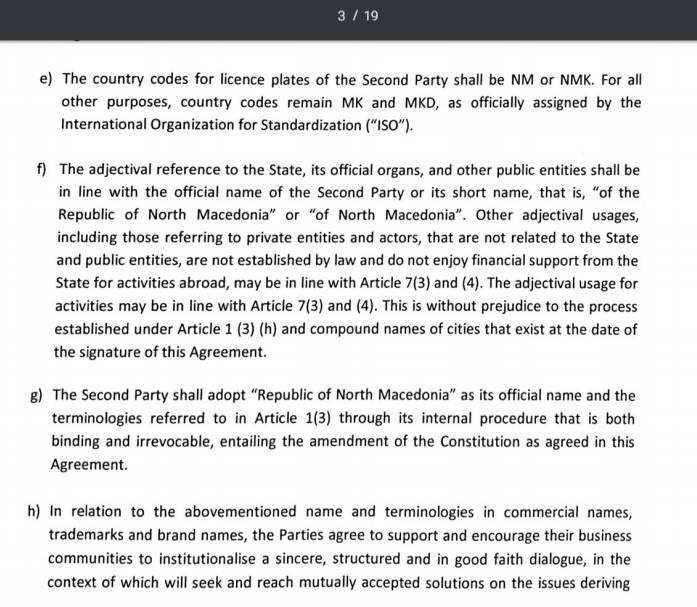 Па, така, во согласност со член 1 од договорот, „придавската референца за државата, за нејзините официјални тела и за други јавни институции ќе биде во согласност со официјалното име на втората страна или со нејзиното скратено име, што значи ‘на Република Северна Македонија’ или ‘на Северна Македонија’. Другите употреби на придавката, вклучувајќи ги и оние што се однесуваат на приватните субјекти или актери, кои не се поврзани со државните и јавните субјекти, што не се опфатени со законот и немаат финансиска поддршка од државата за активности во странство, може да бидат според член 7 (3) и (4). Употребата на придавката за активности може да биде според член 7. Ова е без предрасуди кон процесот утврден со членот 1 (3) и сложените имиња на градовите што постојат на датумот на потпишувањето на овој договор“.