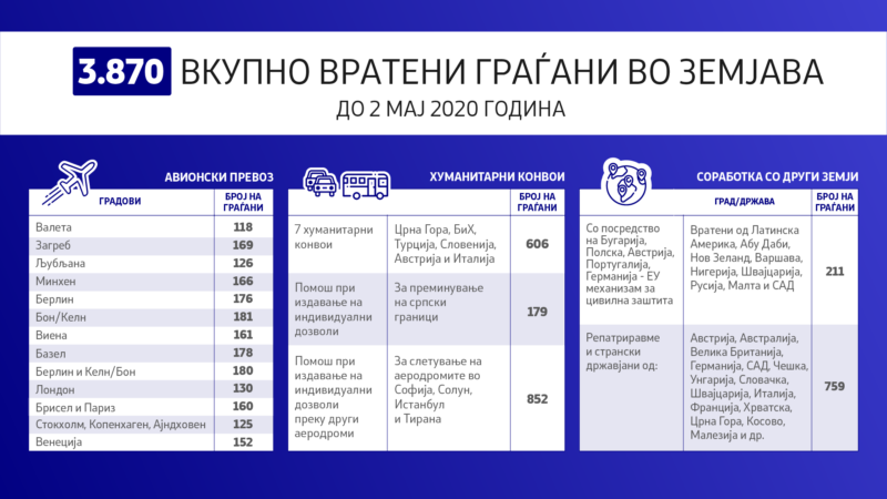Со ова, вкупната бројка на репатрирани македонски граѓани со посредство на Министерството за надворешни работи до денес изнесува 3.870.