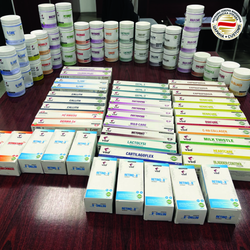 4,32 килограми и 1.17 литри (75 пакувања) разни суплементи за домашни миленици (Multivit, Ascoraid, Petimmun Plus, Dentalcare, O2 Care Plus, Milk Thistle, Retino – A Plus, Derma Zn, Bladdercontrol и други), се откриени од мобилен царински тим при контрола на автомобил со македонски регистарски таблички на влез во државата на граничен премин Блаце.