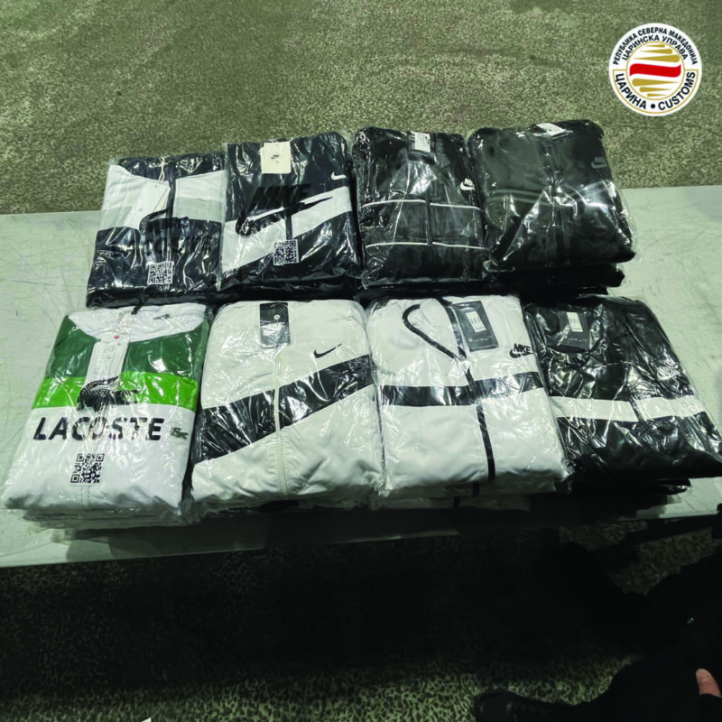 „636 парчиња облека со ознаки на заштитени трговски марки се откриени од мобилен царински тим, при контрола на камион со македонски регистарски таблички натоварен со стока со потекло од Турција. Случајот е откриен при длабинска контрола на товарно моторно возило извршена во царинскиот терминал Скопје 4.