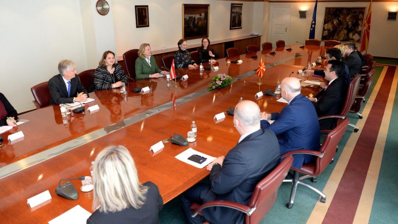 Премиерот Зоран Заев, придружуван од министерот за надворешни работи, Никола Димитров, и државниот секретар во МНР, Виктор Димовски, денеска се сретна со Карин Кнајсл, сојузната министерка за Европа, интеграции и надворешни работи на Република Австрија, придружувана од Ренате Колбер, амбасадорка на Република Австрија во Република Македонија.