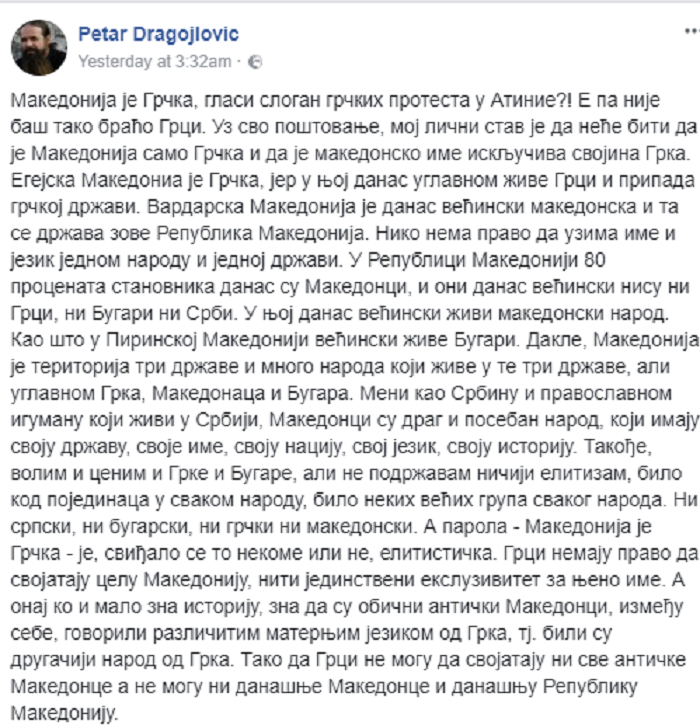 Македонија е грчка, гласи слоганот на грчките протести во Атина?! Е па не е баш така браќа Грци. Со сета почит, мојот личен став е дека Македонија не е само грчка и дека македонското име е исклучива сопственост на Грците. Егејска Македонија е грчка затоа што денес таму живеат главно Грци и ѝ припаѓа на грчката држава. Во Вардарска Македонија мнозинството се Македонци и таа држава се вика Република Македонија. Никој нема право да му го одзема името и јазикот на еден народ и една држава. Во Република Македонија 80 отсто од жителите денес се Македонци и мнозинството денес не се ниту Грци, ниту Бугари, ниту Срби. Во неа денеска мнозинството се Македонци. Како што во Пиринска Македонија мнозинството се Бугари. Значи, Македонија е територија на три држави и многу нации кои живеат во тие три држави, но претежно Грци, Македонци и Бугари, напиша српскиот игумен Петар Драгојловиќ на „Фејсбук“.
