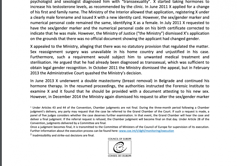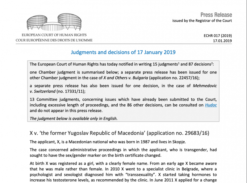 „Коалицијата ‘Маргини’ денес во судот во Стразбур доби позитивна пресуда во случајот ‘X против Македонија’, во кој судот утврди дека постојната законска рамка има јазови и сериозни недостатоци што го довеле транслицето во ситуација на стрес и несигурност во признавањето на неговиот родов идентитет.