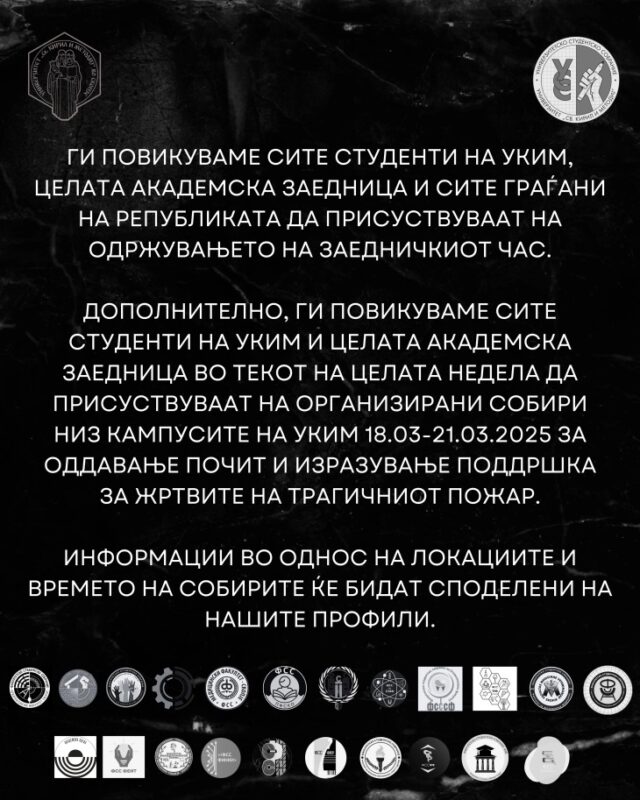 Студентите и професорите на Скопскиот универзитет ќе присуствуваат на организирани собири – Заеднички час за да изразат почит на жртвите во пожарот на концертот во Кочани и поддршка на нивните семејства.