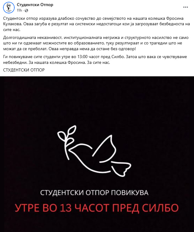 Студентскиот отпор изразува длабоко сочувство до семејството на Фросина Кулакова.