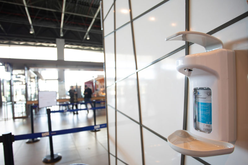 Дополнително, како што посочуваат, поставени се средства за дезинфекција на рацете за патниците на неколку клучни точки: кај шалтерите за регистрација, кај пунктот за безбедносна контрола (при излез од државата, веднаш по пасошката контрола), како и во делот „пристигнувања“ (при влез во државата, во близина на пасошката контрола)“