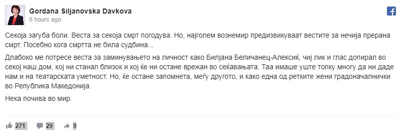 Оперскиот пејач Игор Дурловски од актерката Билјана Беличанец се прости со зборовите: „Најчесто доцниме со некој убав збор… Мирен пат Билјана Беличанец“.