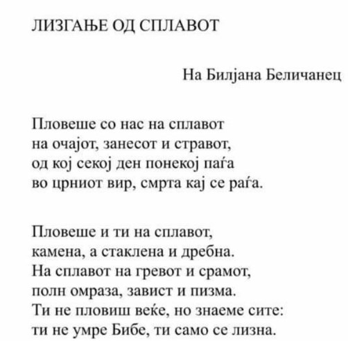 „Билјана Беличанец. Ретка билка со раскошен талент за цветање. Можеше да даде уште многу цутови. И сакаше. А не напушти на најтрагичниот од сите можни начини. Како вистинска античка хероина. Вечна пролет за неа и за нејзиниот редок и убав цвет“, напиша тој.