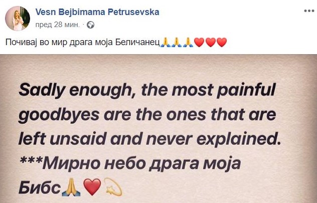 „Почивај во мир драга Беличанец, во вечноста пронајди го тоа што овде не можеше… бескрајно ќе ни недостасуваш“, напиша актерката, Јелена Жугиќ.