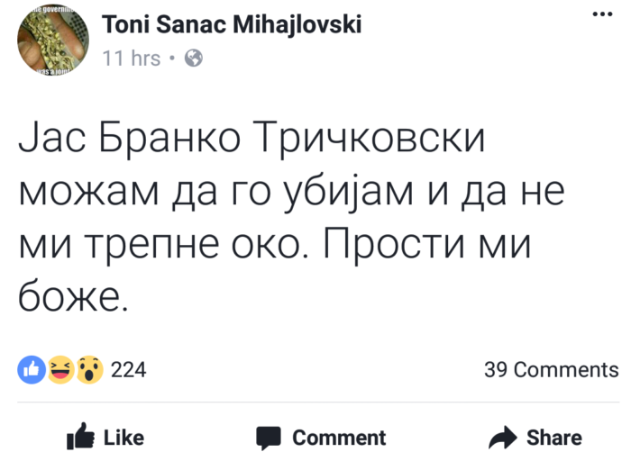 Тони Михајловски остана недостапен за коментар, по отворениот предмет на ОЈО. Тој на социјалните мрежи, пред една година, напиша „Би можел да го убијам Бранко Тричковски и око нема да ми трепне“.