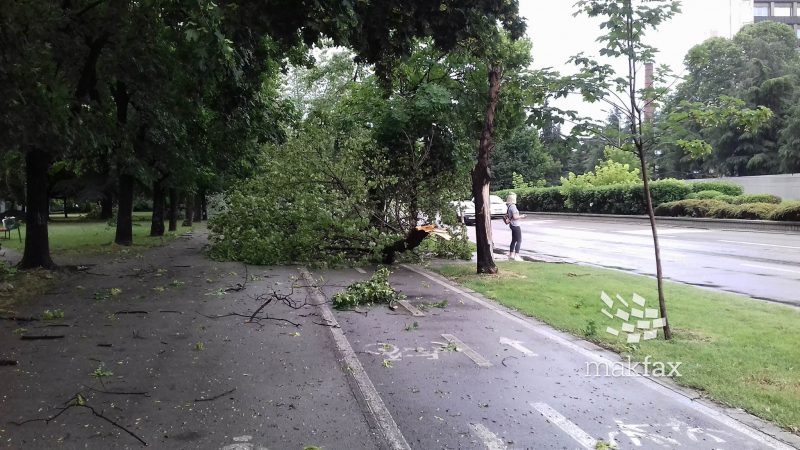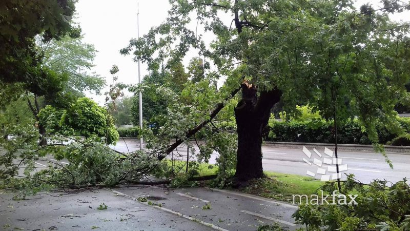 Во населбата Автокоманда тротоарите се целосно покриени со паднати дрвја, по невремето во Скопје.