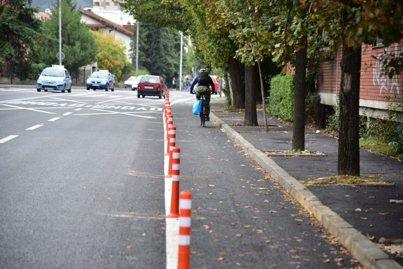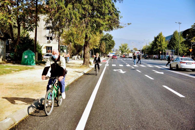 На улицата Никола Карев од четирите постојни сообраќајни ленти сега се направени три со што е обезбеден простор за велосипедистите.