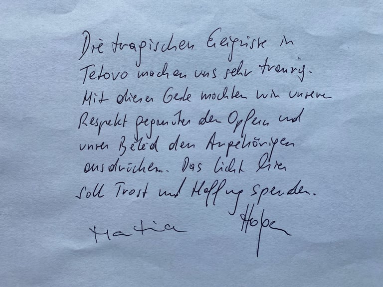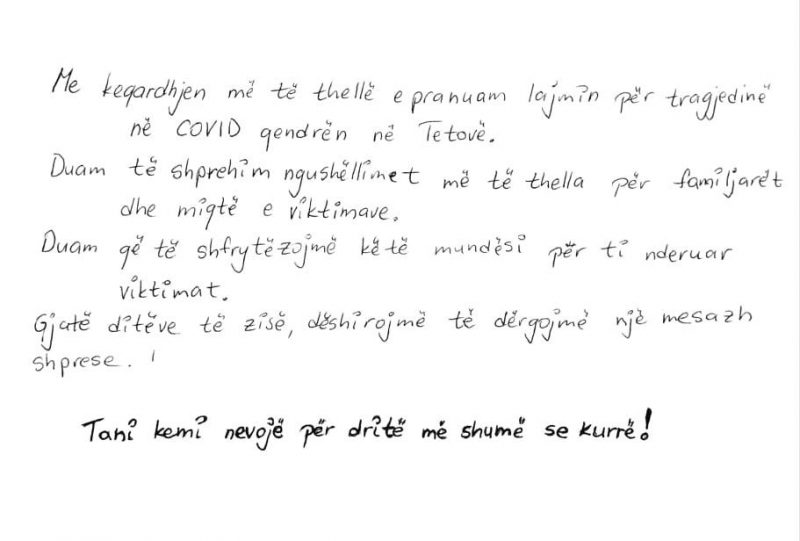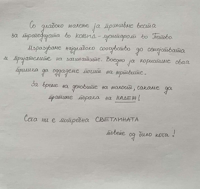 „Со длабоко жалење ја примивме веста за трагедијата во КОВИД центарот во Тетово. Изразуваме најдлабоко сочувство до семејствата и пријателите на загинатите. Воедно, ја користиме оваа прилика да оддадеме почит на жртвите. За време на деновите на жалост, сакаме да испратиме порака на надеж. Сега ни е потребна светлината, повеќе од било кога“, гласи заедничката порака на продукцијата и уметниците.