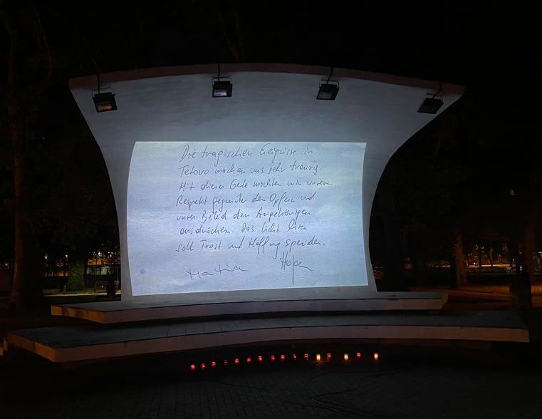Уметниците на Skopje Light Art District оддадоа почит на жртвите од Тетово со пораки на 14 јазици испишани на Школка