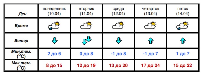 Минималната температура ќе биде во интервал од -4 до 4, а максималната ќе достигне од 15 до 20 степени.
