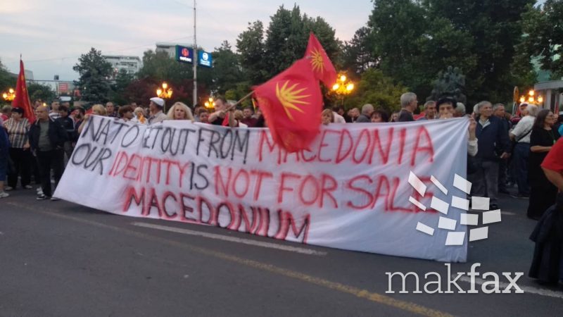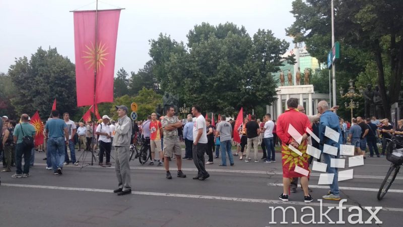 Демонстрантите извикуваат „Македонија“, „Македонија на Македонците“ и скандираат „Заев предавник“.