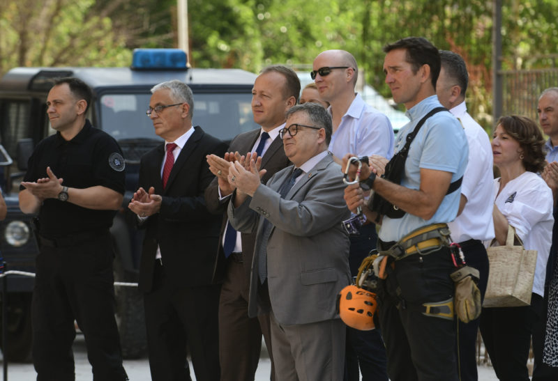 Заменик-министерот за внатрешни работи, Агим Нухиу, и францускиот амбасадор Кристијан Тимоние денеска присуствуваа на завршната вежба на припадниците на алпинистичкиот тим на Единицата за специјални задачи – Техники на интервенција со употреба на јаже во урбани и природни средини.