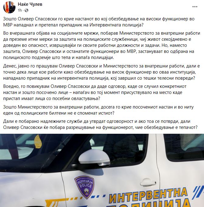 Воедно, Чулев бара Оливер Спасовски и раководството на МВР да дадат одговор на прашањето кој го крие настанот во кој обезбедување висок функционер во МВР нападнал и претепал припадник на Интервентната полиција и да дадат одговор на прашањето каде се случило ова и како на тоа место присуствувало лице што нема овластување за тоа.