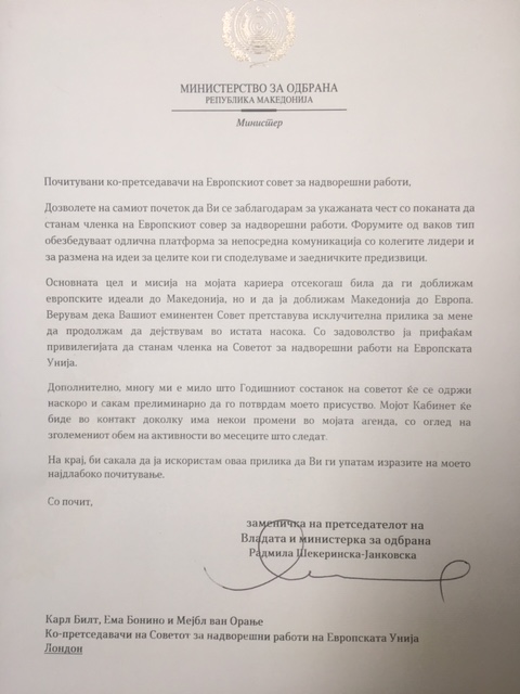 „Основната цел и мисија на мојата кариера отсекогаш била да ги доближам европските идеали до Македонија, но и да ја доближам Македонија до Европа. Верувам дека Вашиот еминентен Совет претставува исклучителна прилика за мене да продолжам да дејствувам во истата насока. Со задоволство ја прифаќам привилегијата да станам членка на советот на Европскиот советот за надворешни работи“, наведува министерката во писмото.