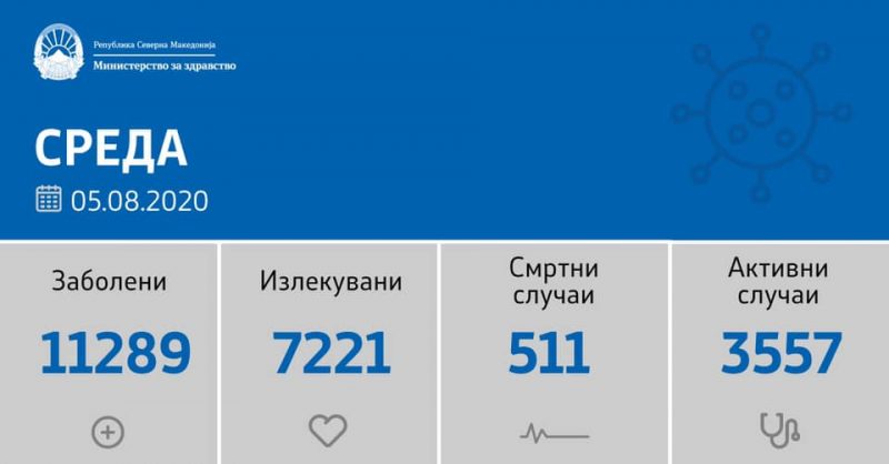 Вкупната бројка на ковид-дијагностицирани во нашата земја од почетокот на епидемијата изнесува 11.289, бројката на оздравени пациенти е 7.221, на починати е 511, а во моментот бројот на активни случаи во земјата изнесува 3.557.