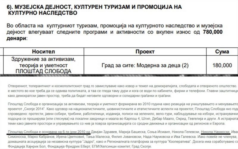 Здружението „Плоштад слобода“, чиј основач е Никола Наумоски, сегашниот шеф на кабинетот на скопскиот градоначалник Петре Шилегов, доби 180 илјади денари од градот за младински проект. Нема кој да оцени дали има конфликт на интереси оти нема антикорупциска комисија. Од Град Скопје се правдаат дека одобрените пари минале низ шест стручни комисии, кои не виделе ништо спорно, но Наумоски сè уште фигурира како основач на „Плоштад слобода“, со што се прослави во борбата против проектот „Скопје 2014“.