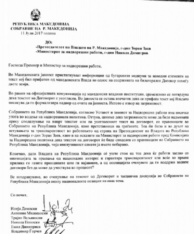 Пратениците Илија Димовски, Антонијо Милошоски, Трајко Вељаноски, Никола Попоски, Емил Димитриев и Владимир Ѓорчев од ВМРО-ДПМНЕ испратија писмо до премиерот Зоран Заев и до министерот за надворешни работи, Никола Димитров, во кое бараат да го споделат текстот од договорот што ќе биде потпишан со Бугарија.
