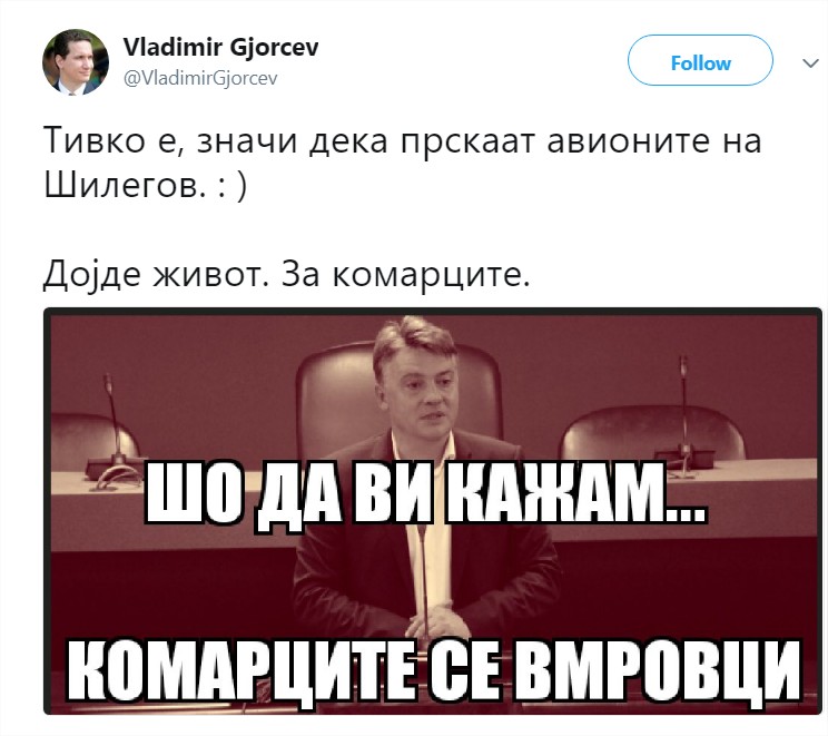 „Тивко е, значи дека прскаат авионите на Шилегов. Дојде живот. За комарците. Пред една година Скопје ги дочека ‘Реал Мадрид’ и ‘Манчестер’. Денес Шилегов не може да испрска против комарци. Врати се Коце. Толку“, пишува Ѓорчев.