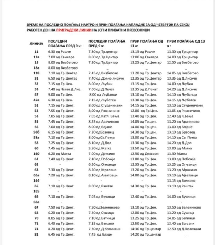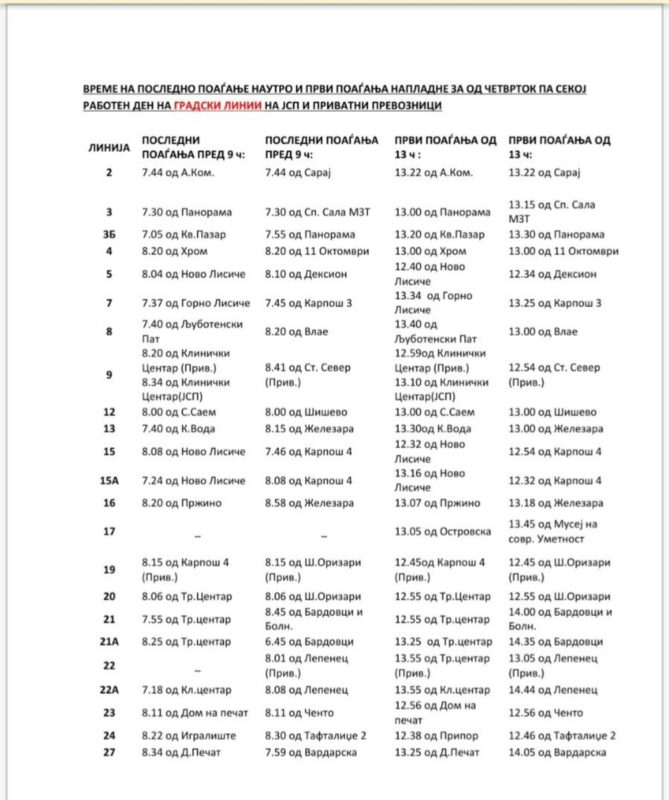 ЈСП информира дека од утре, четврток, 9 април, па секој работен ден, јавниот превоз ќе функционира од 5 до 9 часот, па од 13 до 16 часот, односно од 9 до 13 часот, автобуси нема да сообраќаат.