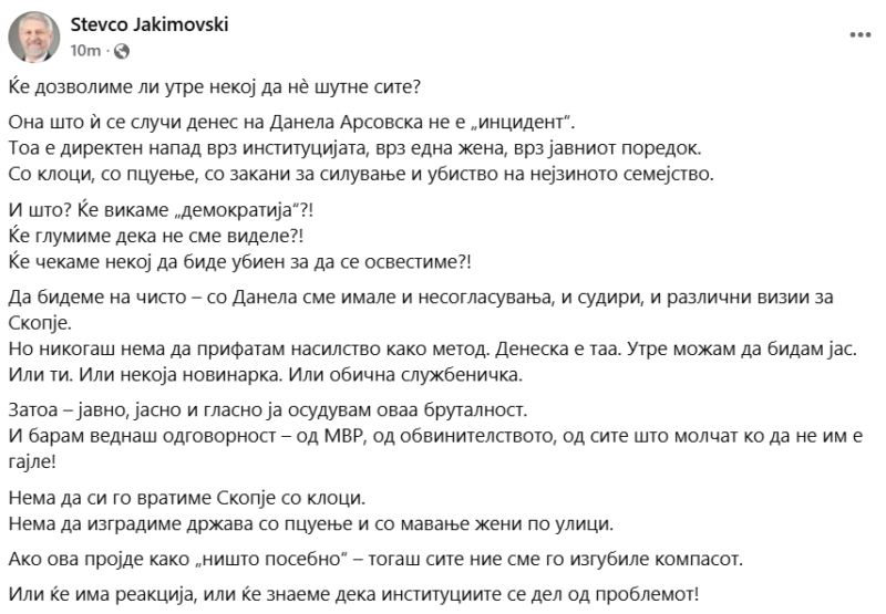 Градоначалникот на општина Карпош, Стевчо Јакимовски се огласи на социјалните мрежи, по нападот врз градоначалничката Данела Арсовска.