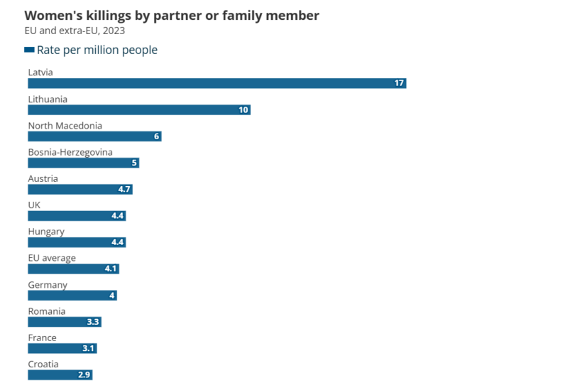 Според податоците, во Северна Македонија биле убиени шест жени на еден милион жители, што ја става земјата веднаш зад Латвија и Литванија. Латвија бележи највисока стапка во Европската Унија со околу 17 жени убиени на милион жители, додека Литванија е на второто место со 10 жени на милион жители.