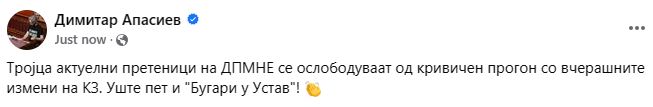 „Тројца актуелни пратеници на ДПМНЕ се ослободуваат од кривичен прогон со вчерашните измени на КЗ. Уште пет и ‘Бугари у Устав!’“, вели Димитар Апасиев.