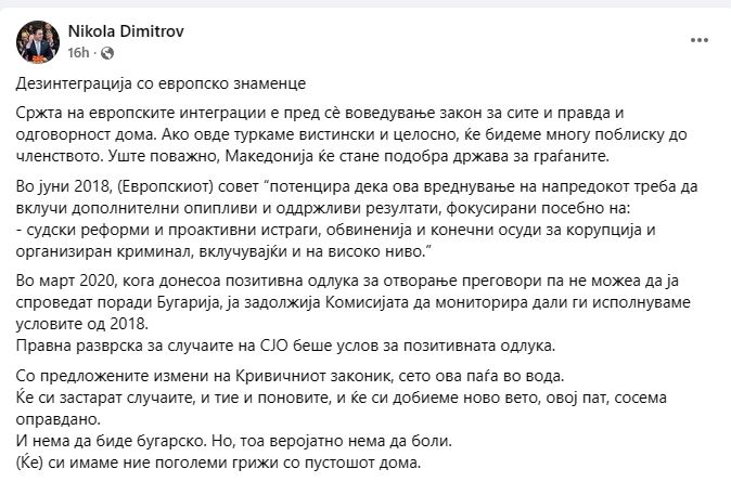 И нема да биде бугарско. Но, тоа веројатно нема да боли. (Ќе) си имаме ние поголеми грижи со пустошот дома“, пишува поранешниот министер за надворешни работи, Никола Димитров.