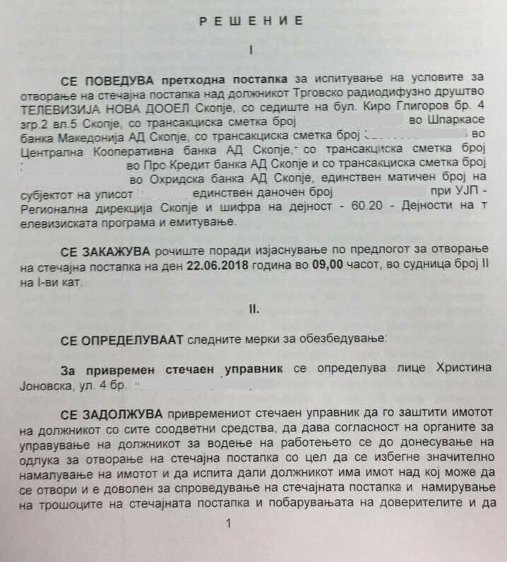 Основниот суд Скопје 2 преку стечајната судијка Ирена Петрушевска на 22 јуни закажа рочиште пред отворање стечај за телевизијата на Сеад Кочан, „Нова“. 43 поранешни вработени како доверители, кои го бараат стечајот, бараат да им бидат исплатени сите плати и придонеси. На барањето е потпишана и урендичката Анита Петровска-Рајковиќ. За привремен стечаен управник е определна Христина Јоновска, која треба да го заштити имотот на должникот со сите средства до донесувањето одлука за отворање стечајна постапка. Вработените се надеваат дека ќе се договорат со раководството за исплата на заостанатите плати, без да биде отворена стечајна постапка.