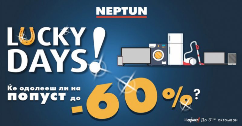 „Lucky days” од 25-31 октомври во „Нептун” – продажна акција со најголеми попусти! Ќе одолееш ли на ПОПУСТ до -60%? Вистинска можност за купување на производи со најголеми попусти и до 60 рати на HAPPY цени. Разгледајте ги понудите во сите продажни салони на Нептун ширум Македонија или онлајн на Neptun.mk и изберете од најголемиoт избор на: телевизори, фрижидери, машини за перење и сушење, плотни, фурни, лаптопи и таблети, мобилни телефони, мали апарати за домаќинство и апарати за нега и убавина од брендовите: Beko, Samsung, LG, Huawei, Sony, Apple, Grundig, Elektrolux, Candy, Asus, Acer, Lenovo, Fuego, Bosch, Tefal, Rowenta и многу други.