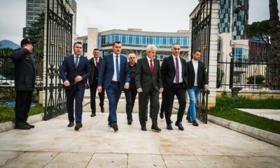 Претседателот на Демократската унија за интеграција, Али Ахмети, придружуван од првиот вицепремиер Артан Груби, генералниот секретар на ДУИ Фатон Ахмети и шефот на пратеничката група и...