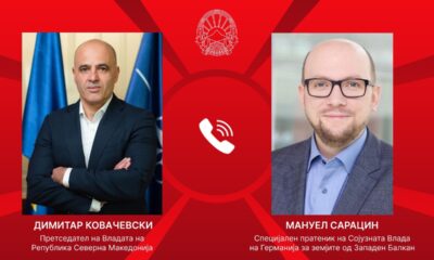 Претседателот на Владата, Димитар Ковачевски, утрово имаше телефонски разговор со специјалниот пратеник на Сојузната влада на Германија за земјите од Западен Балкан, Мануел Сарацин. Премиерот и...
