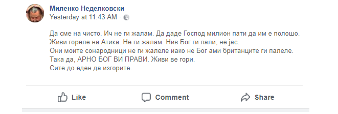 Јавноста реагира на социјалните мрежи по пишувањето на водителот Миленко Неделковски, кој на „Фејсбук“ објави: „Арно бог ви прави. Живи ве гори. Сите до еден да изгорите“.