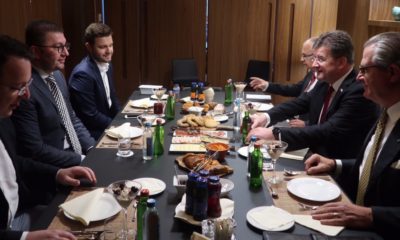 Претседателот на ВМРО-ДПМНЕ, Христијан Мицкоски, заедно со потпретседателот на ВМРО-ДПМНЕ, Александар Николоски, и секретарот за меѓународна соработка на ВМРО-ДПМНЕ, Тимчо Муцунски, оствари работен појадок со министерот...