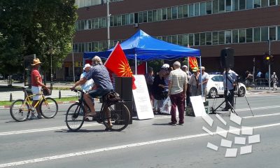 Дваесет до триесет луѓе со знамиња го блокираа булеварот пред собранието и поставија тенди на улицата, со протест против промената на уставното име. Тие извикуваат: „Предавници….Уа..не...